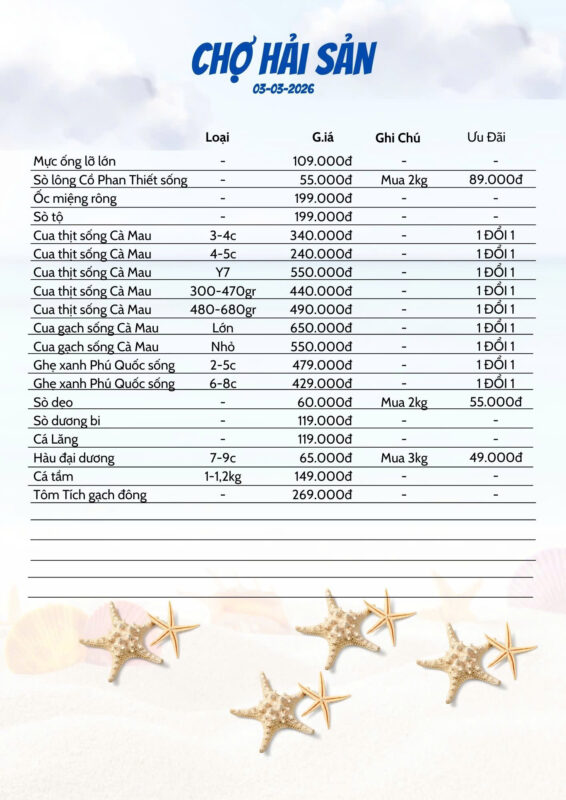 1. Cập nhật bảng giá hải sản hôm nay 3/3/2026 tại hệ thống HẢI SẢN LỘC